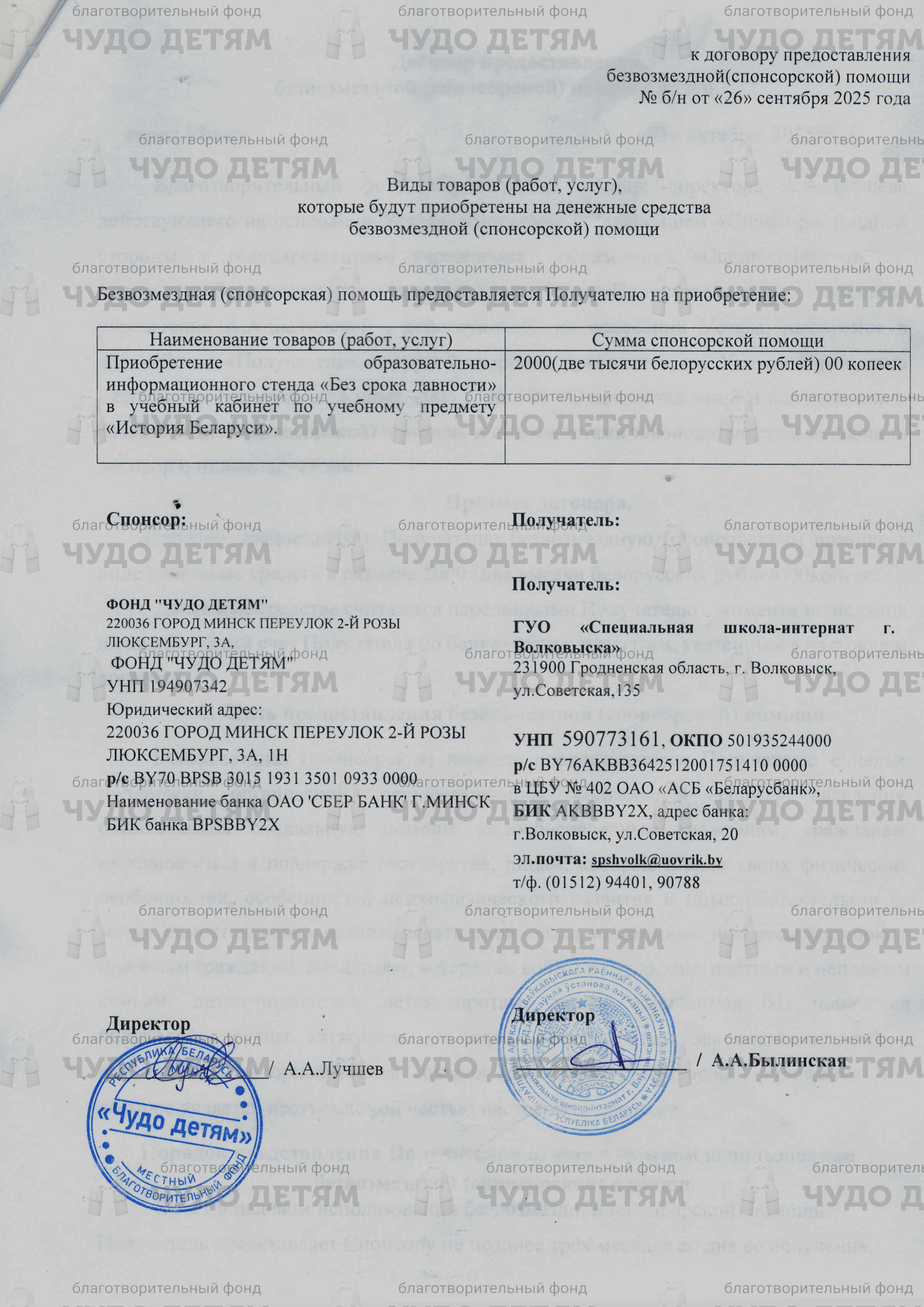 Наш фонд оказал безвозмездную (спонсорскую) помощь ГУО "Специальная школа-интернат г. Волковыск" в приобретении образовательно-информационного стенда в учебный кабинет по учебному предмету "История Беларуси" на сумму 2000 byn.