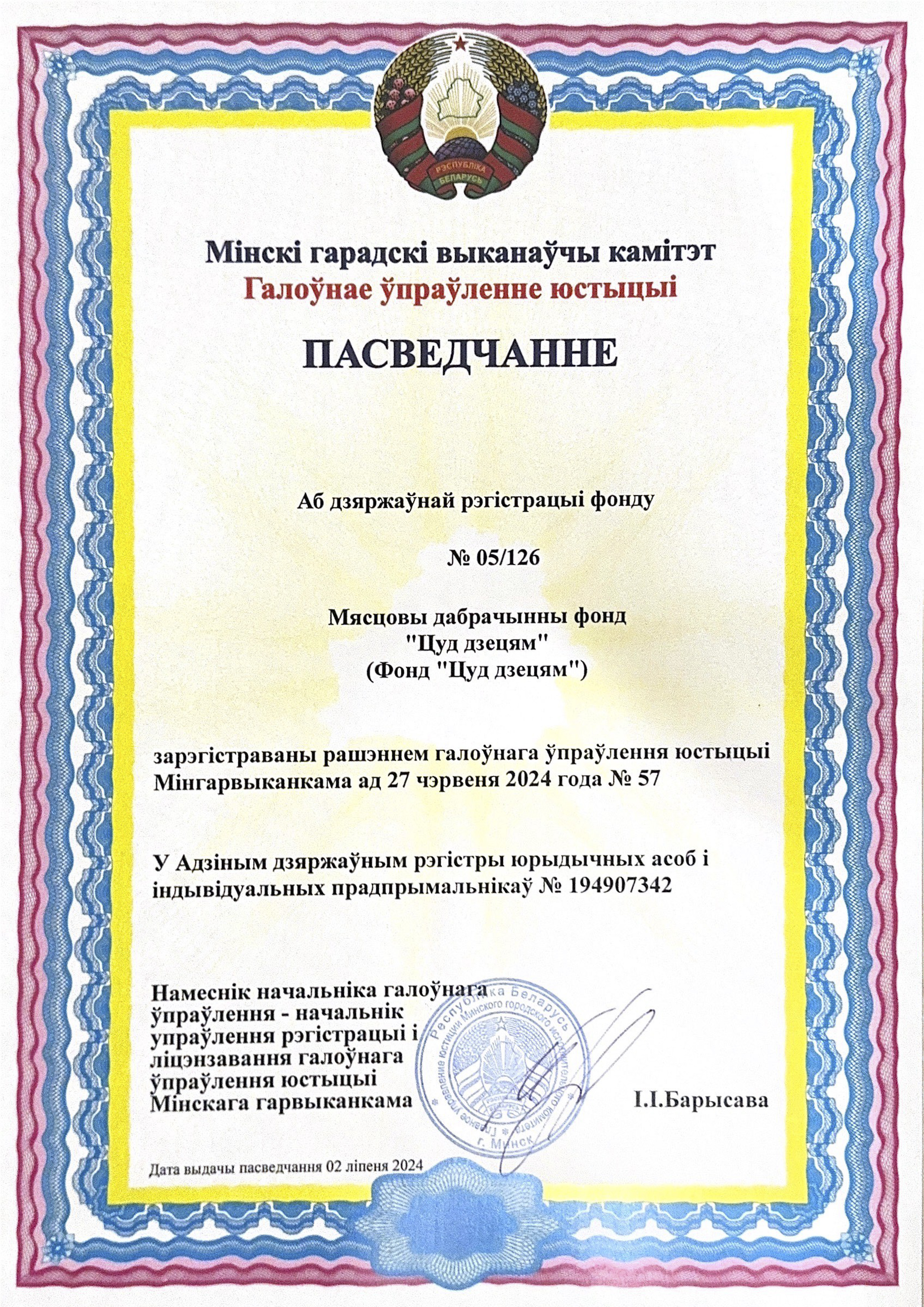 Удостоверение о государвственной регистрации фонда «Чудо детям»