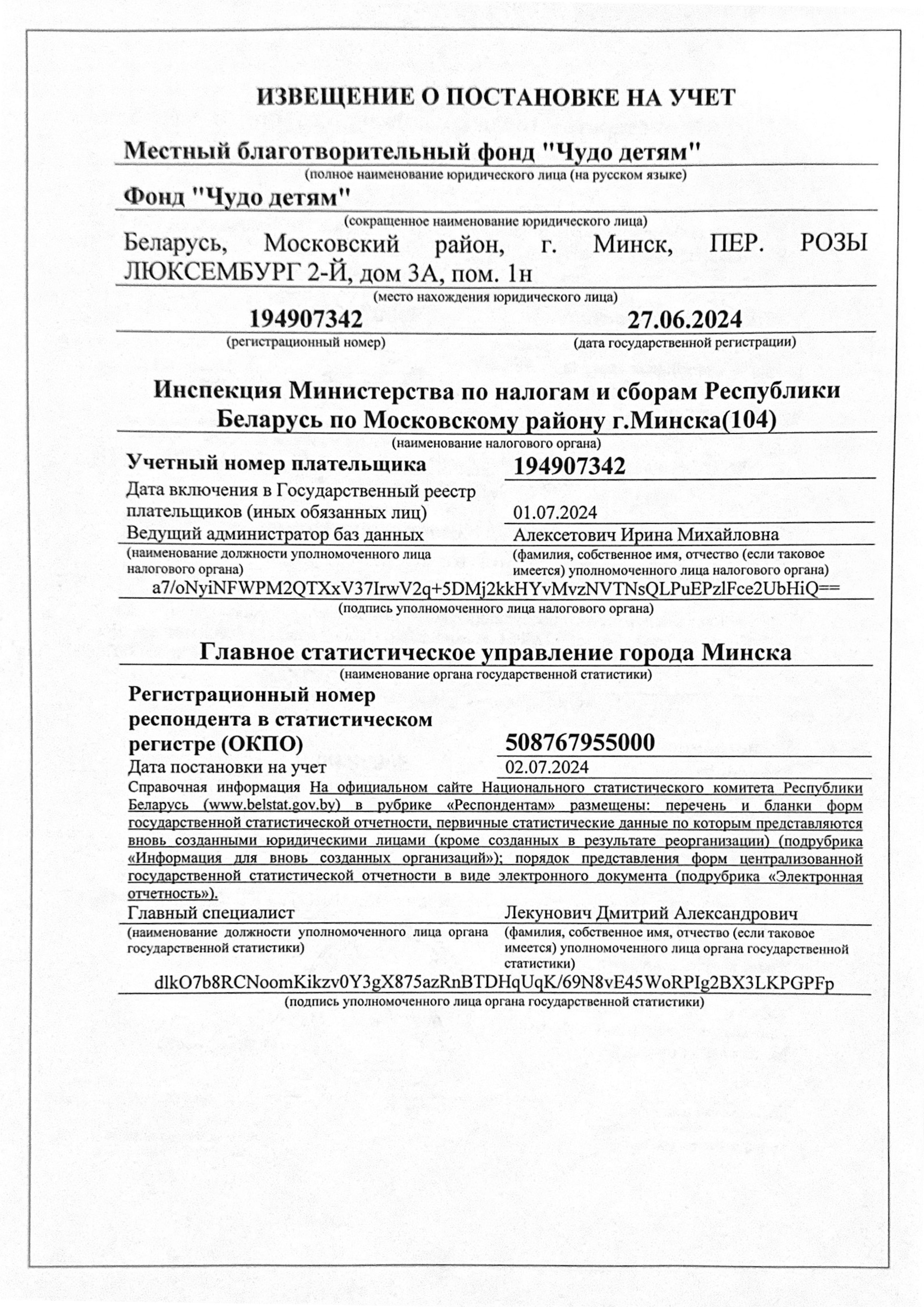 Извещение о учете Благотворительного фонда «Чудо детям»