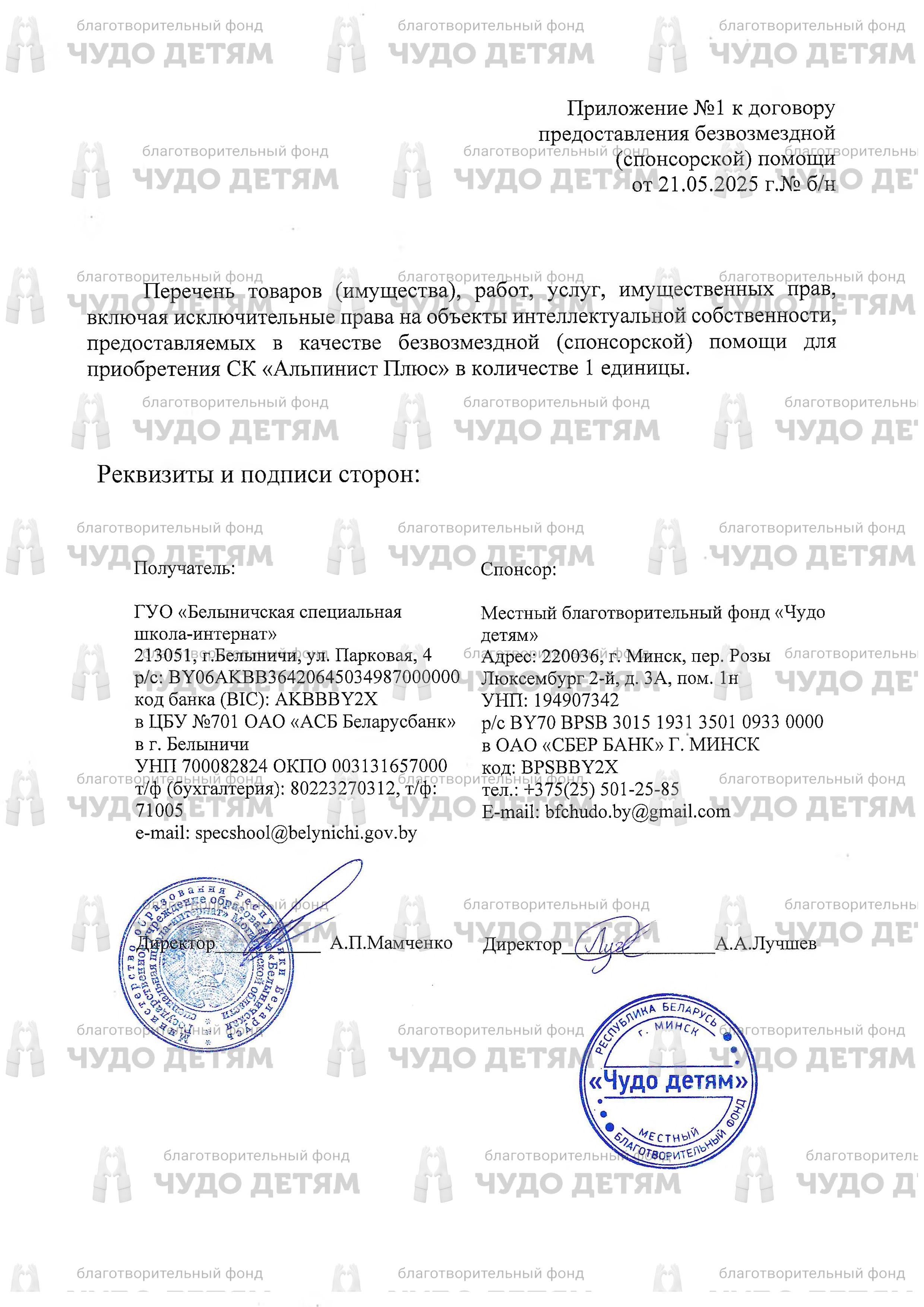 Фонд «Чудо детям» оказал помощь ГУО «Белыничская специальная школа-интернат», оплатив приобретение спортивного комплекса «Альпинист Плюс». Оборудование будет использовано для развития физических навыков воспитанников и создания безопасной, активной среды для занятий и игровой деятельности.