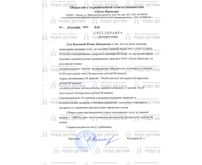 Наш фонд завершил сбор средств на реабилитацию для Высоцкого Максима. Сумма сбора составила 7 980 BYN — средства полностью оплачены и направлены по назначению. В этом видео вы видите фрагменты реального курса реабилитации Максима. Занятия проходят в индивидуальном формате и включают программы «Мыслители», логомассаж и логопедические занятия. Это не отчётные кадры, а обычный рабочий процесс — так выглядит помощь, которая действительно работает. Поддерживая фонд «Чудо детям», вы помогаете детям получать необходимую реабилитацию и поддержку тогда, когда она особенно важна. Спасибо всем, кто помогает и остаётся рядом.
